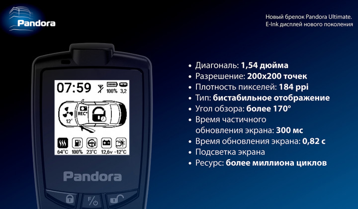 Главное отличие версии Ultimate — входящий в комплект брелок Pandora Ultimate. Он отличается улучшенной эргономикой, высокой дальностью связи и чёткой обратной связью даже в условиях плотной городской застройки и радиопомех. Информативный экран и продуманное расположение элементов управления позволяют быстро получать подтверждение команд и контролировать состояние автомобиля без обращения к смартфону.